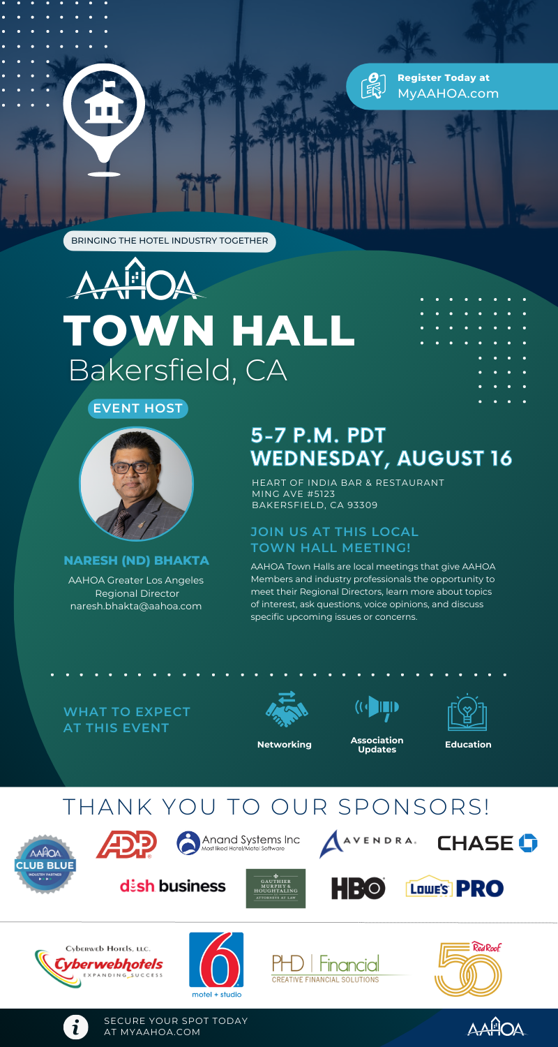 By registering for this event, you consent to receive autodialed, pre-recorded calls, or texts from or on behalf of AAHOA regarding AAHOA events and initiatives at the telephone number provided above. Message or data rates may apply. You consent to share your first name, last name, company name, title, mailing address, and business phone number with AAHOA vendors at this event.