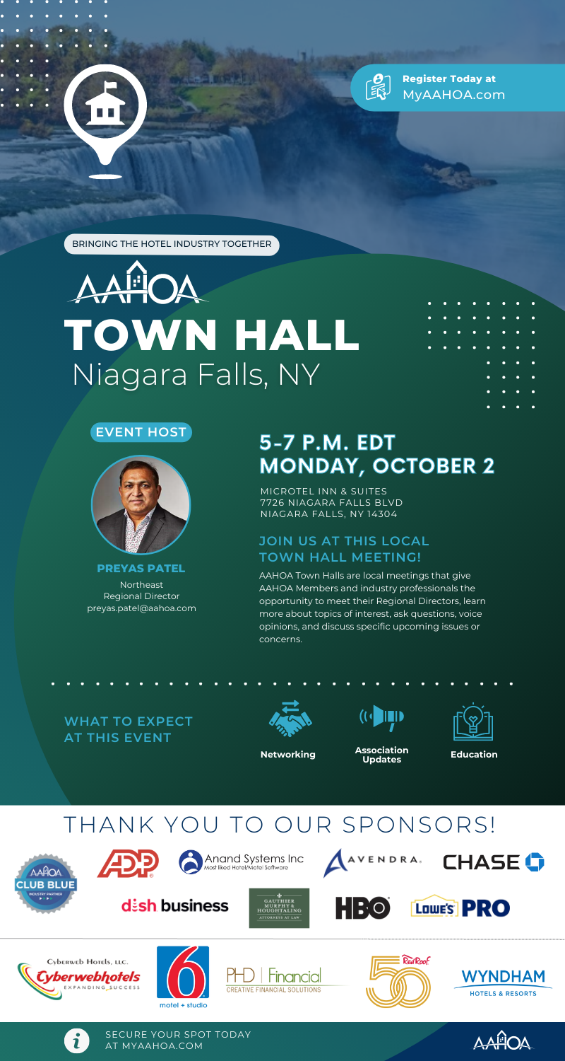 By registering for this event, you consent to receive autodialed, pre-recorded calls, or texts from or on behalf of AAHOA regarding AAHOA events and initiatives at the telephone number provided above. Message or data rates may apply. You consent to share your first name, last name, company name, title, mailing address, and business phone number with AAHOA vendors at this event.